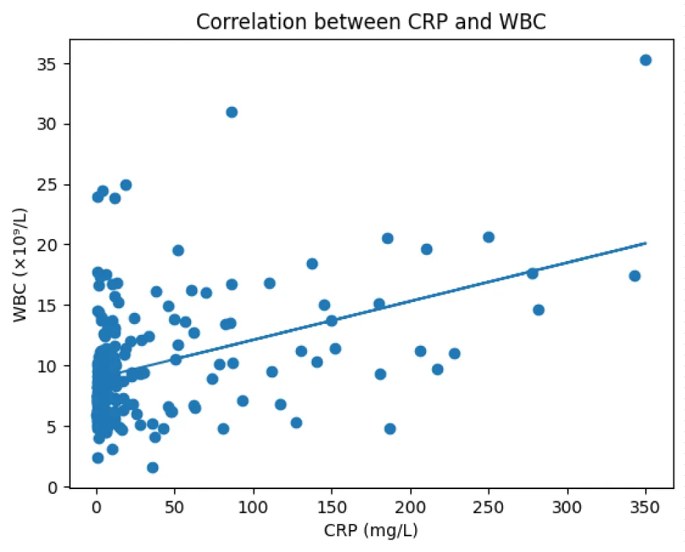 Clinically, the combined assessment of WBC and CRP improves the diagnostic accuracy for infection. In bacterial infections, neutrophil is commonly associated with markedly elevated CRP, whereas viral infections often present with lymphocytosis and comparatively lower CRP levels. In severe infections such as sepsis, CRP may reach extremely high levels and coexist with either leukocytosis or leukopenia, the latter reflecting immune exhaustion or bone marrow suppression [20].