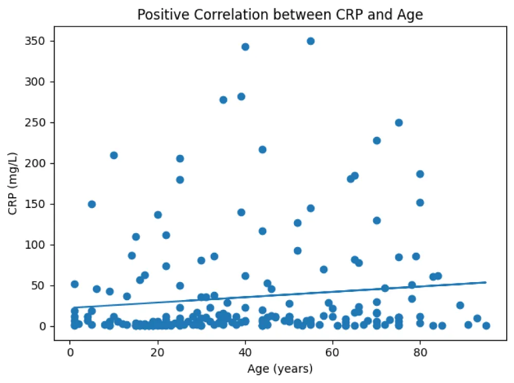 Figure 3: Scatter plot showing the positive correlation between C-reactive protein (CRP) levels and age.