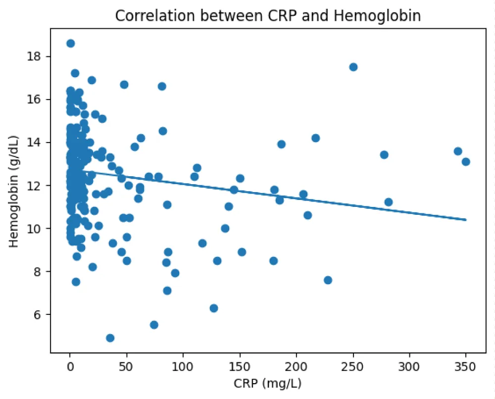 Figure 4: Scatter plot demonstrating the relationship between C-reactive protein (CRP) levels and hemoglobin concentration.