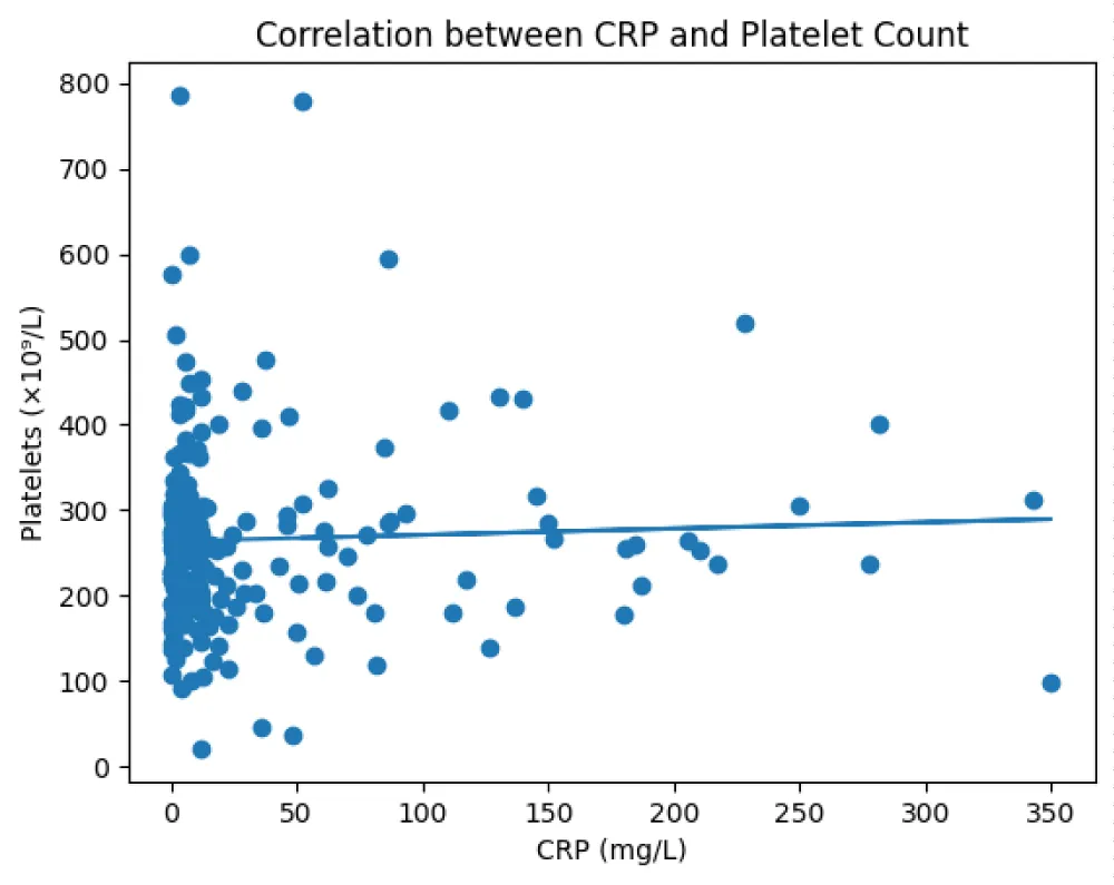 Figure 5: Scatter plot illustrating the relationship between C-reactive protein (CRP) levels and platelet count.
